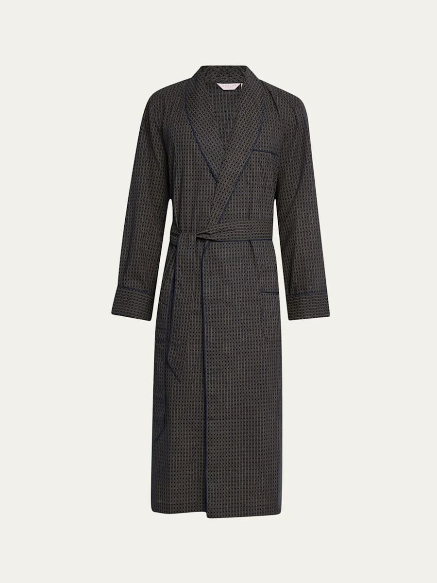 Derek Rose "Nelson" bath robe in cotton showcasing a mini leaf print with contrastring trim Approx. 52"L from shoulder to hem Features a breast pocket and two front pockets for practicality while around the house Vneckline Shawl collar Long sleeves; approx. 25.5"L Selftie waist sash Relaxed fit Cotton Machine wash Made in Czech Republic