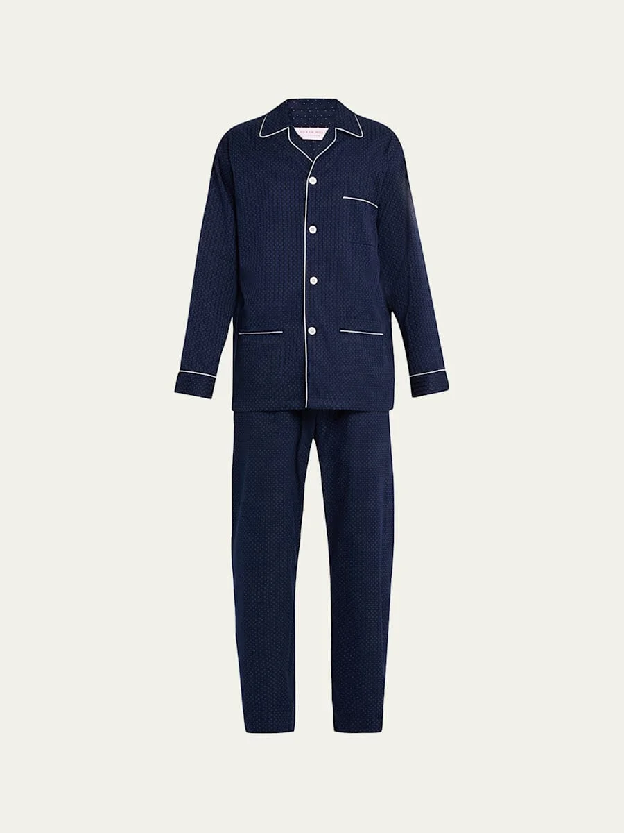 Derek Rose tonal satinstripe pajamas with polkadot print. Contrast piping at collar, cuffs, and pockets. Shirt collar; button front. Long sleeves. Chest and waist patch pockets. Pajama bottoms with adjustable twobutton waistband. Cotton. Made in Czech Republic.