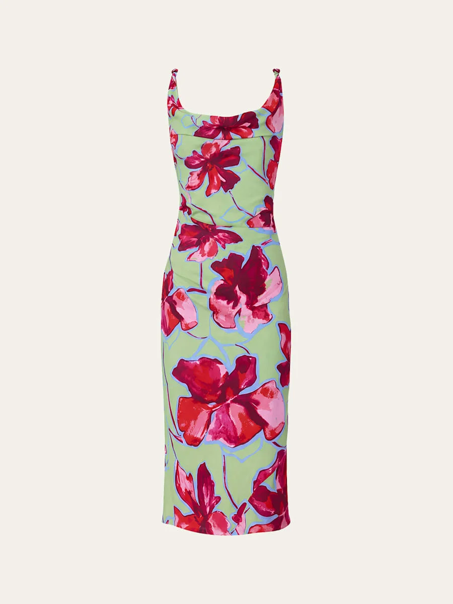 This Diane von Furstenberg "Delaney" midi dress is crafted in bright, floralprint fabric, detailed with ruching along the waist that showcases the figure Cowl neckline Sleeveless Hem falls below the knee Bodycon silhouette Viscose Imported
