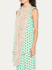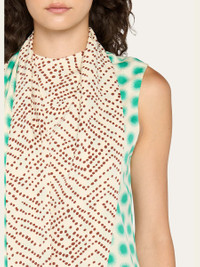 The Diane von Furstenberg x Henry Zankov "Mulberry" top combines classic polka dots with sunburst dots, the exaggerated front drape adding visual intrigue and fluid movement to the piece The capsule collaboration is a harmony between DVF's legendary prints and Zankov's distinctive visual language Mock neckline Sleeveless Relaxed fit Keyhole button back Pullover style Silk/spandex Imported Online Inquiries: BGS21_T8SAE| Store Inquiries: #5399871