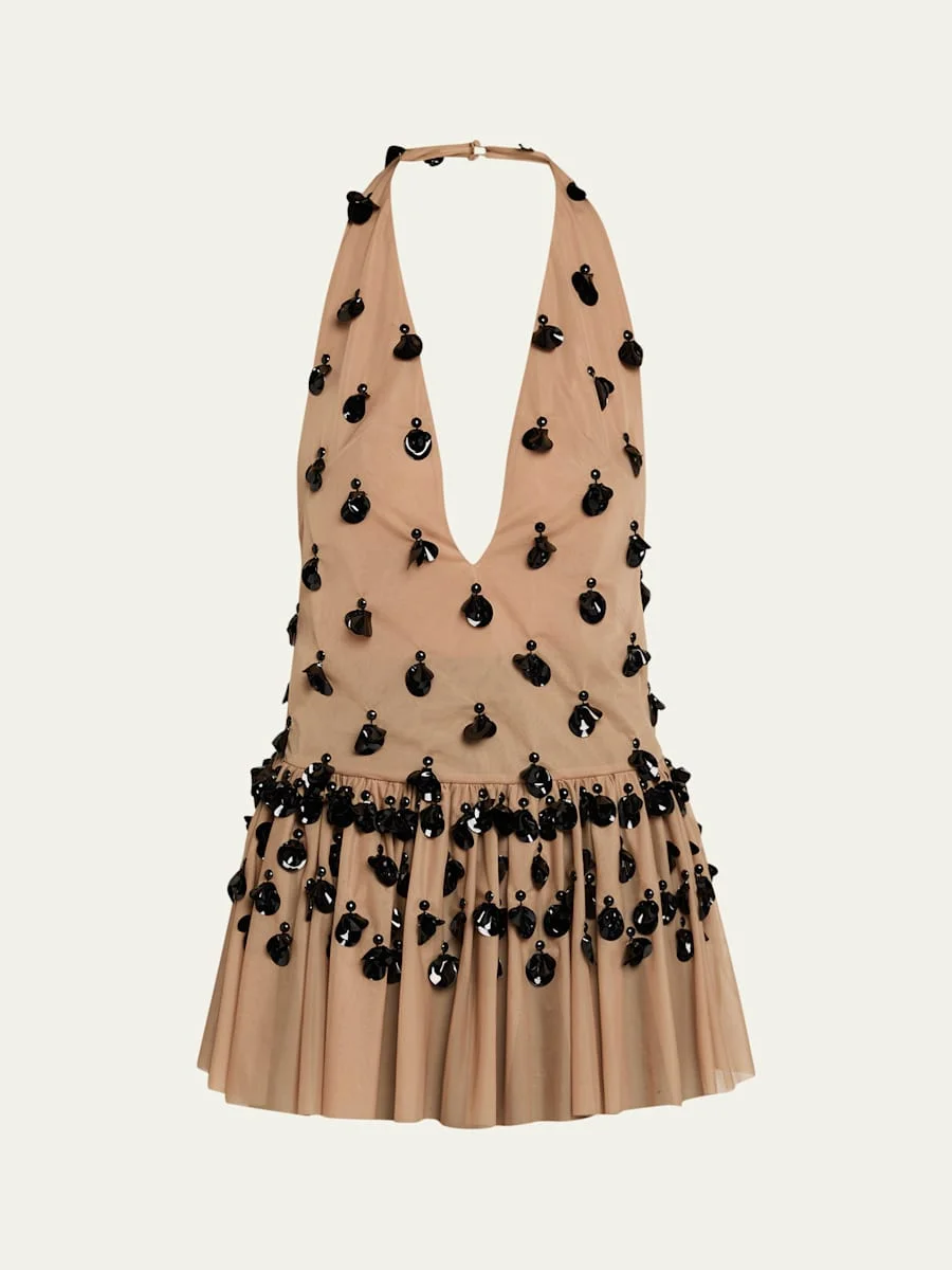 Diotima night top featuring paillette embellishment and a ruffled peplum hem Plunging halter neckline; open back Sleeveless Slim fit Hem falls below the hip Back zip Polyester Professional cleaning recommended Imported Proposition 65 warning for California residents Online Inquiries: BGS21_BA8BF| Store Inquiries: #5051743