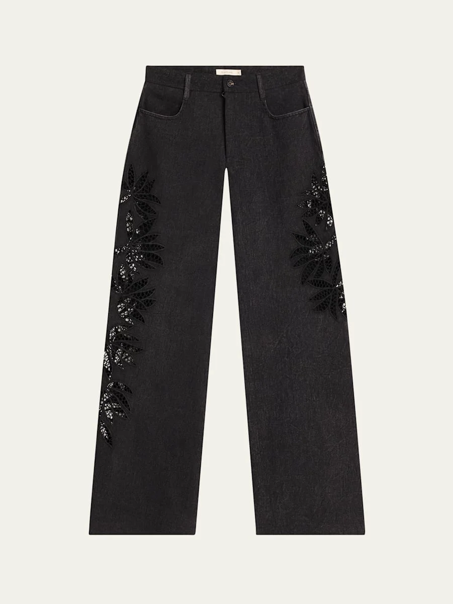 Diotima "Stulla" jeans featuring botanical cutwork on the side of legs Low rise Five-pocket style Wide legs Full length Button/zip fly; belt loops Cotton Professional cleaning recommended Imported Online Inquiries: BGS21_B9MC2| Store Inquiries: #4912657