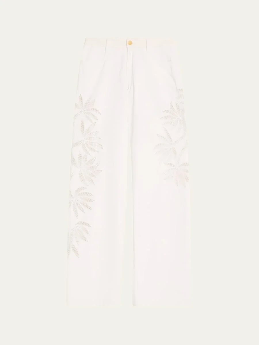 Diotima "Stulla" jeans featuring botanical cutwork on the side of legs Low rise Five-pocket style Wide legs Full length Button/zip fly; belt loops Cotton Professional cleaning recommended Imported Online Inquiries: BGS21_B9MC2| Store Inquiries: #4912657