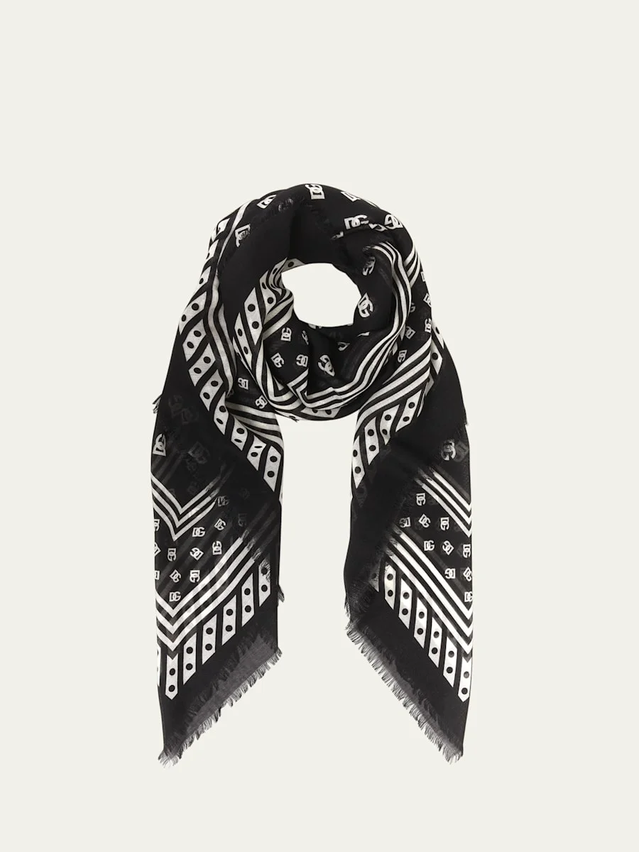 Dolce&Gabbana all-over DG logo print shawl in silk and cashmere Approx. 55.1"Sq. Fringe trim May be styled in multiple ways Made in Italy Online Inquiries: BGS21_D4XY5| Store Inquiries: #4807475