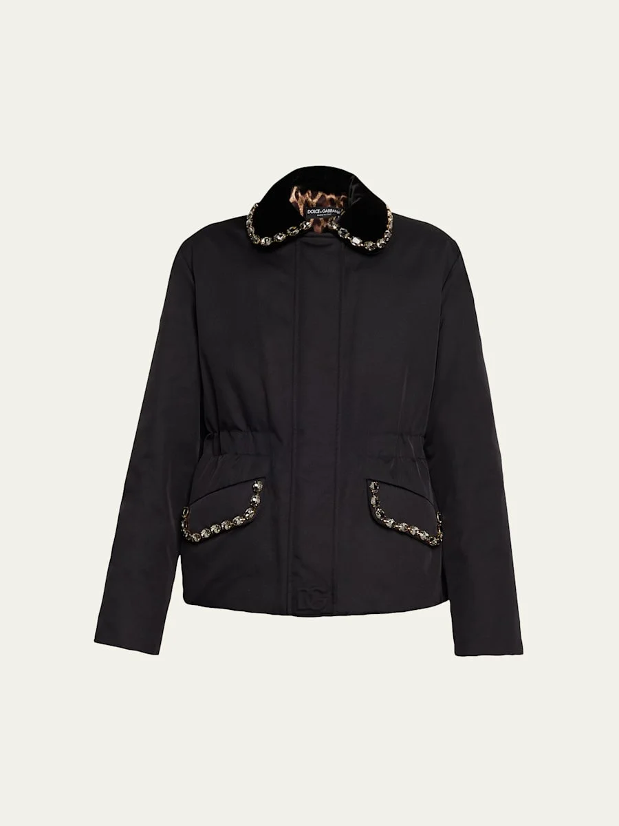 Dolce&Gabbana barn jacket is crafted of a nylon twill featuring a velvet collar embellished with crystal embroidery and a monogram embossed hem detail Peter-Pan collar; concealed front zip Long sleeves Internal drawstring cinched waist Hip flap pockets Relaxed fit Hip length Nylon/polyamide/viscose/cupro Made in Italy Online Inquiries: BGS21_BA2Z3| Store Inquiries: #5021212