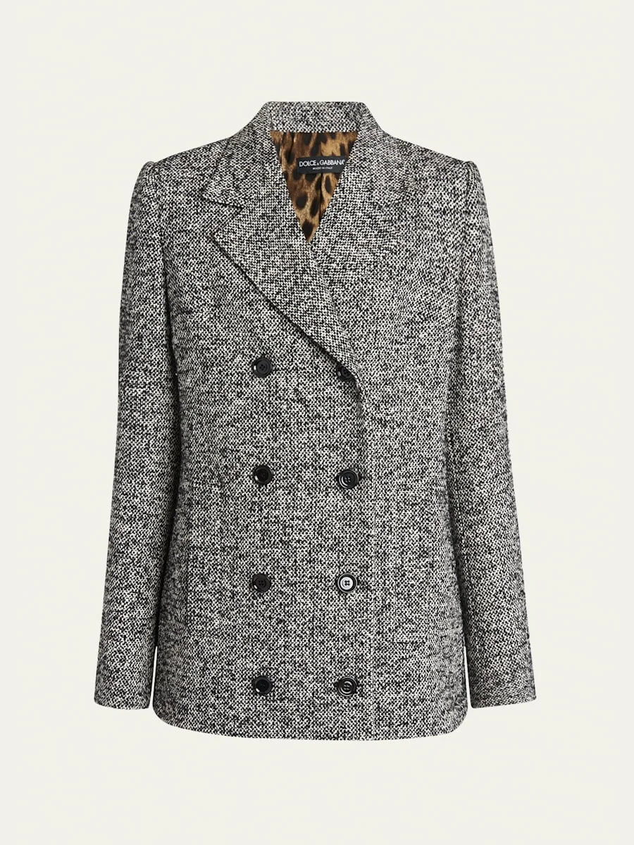 Dolce&Gabbana jacket in dotted wool-blend Notch lapels; double-breasted front Long sleeves; button cuffs Padded shoulders Hip welt pockets Straight fit Hem falls below the hip Virgin wool/silk/nylon/polyamide Made in Italy Online Inquiries: BGS21_BA5QA| Store Inquiries: #5040799