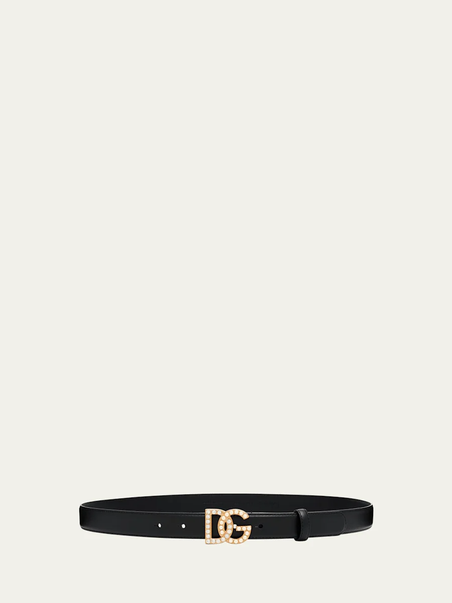 Dolceamp;Gabbana belt in calf leather with Swarovski® crystals and faux pearl (plastic) embellishments Interlocking DG logo buckle Adjustable fit Made in Italy