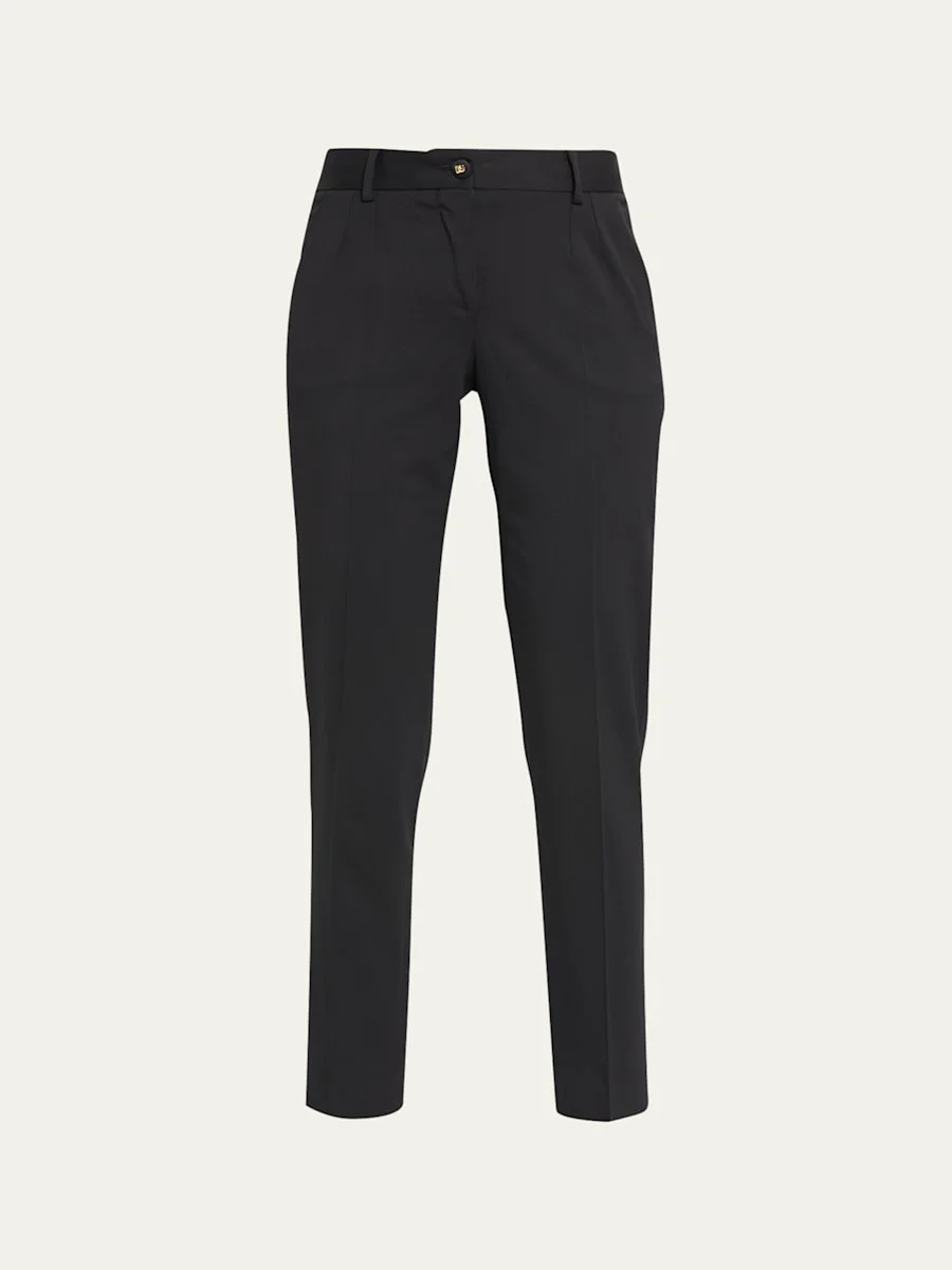 Dolce&Gabbana fitted trouser pants Mid-rise; sits high on hip Button/zip fly; belt loops Side slip pockets; back welt pockets Fitted through skinny legs Ankle length Virgin wool/spandex Made in Italy Model is 5'10"/177cm. Online Inquiries: BGS21_B7YSZ| Store Inquiries: #4430656