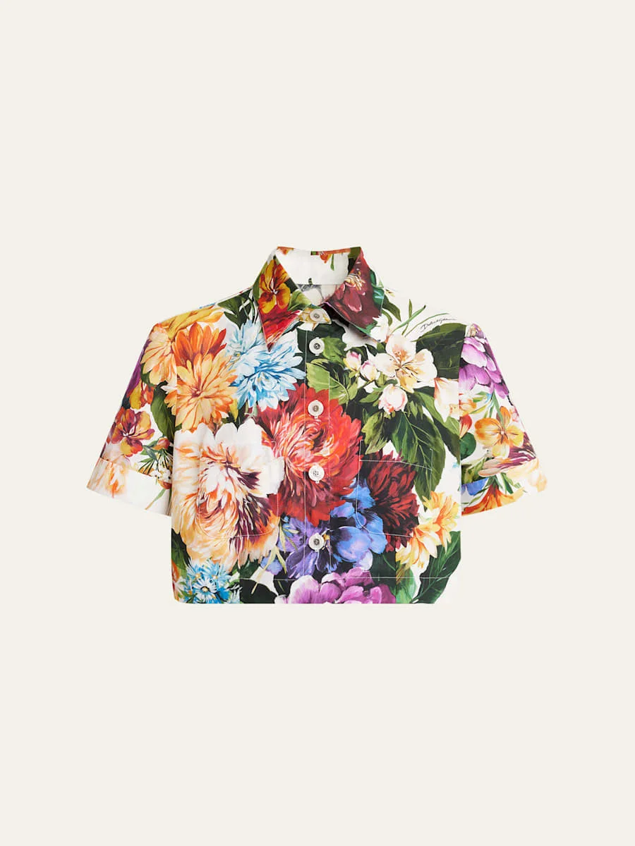 Dolce&Gabbana popeline shirt featuring flower bouquet print Point collar; button front Short sleeves; rolled cuffs Chest patch pockets Straight fit Cropped length Cotton Made in Italy Online Inquiries: BGS21_BA2WZ| Store Inquiries: #5021142