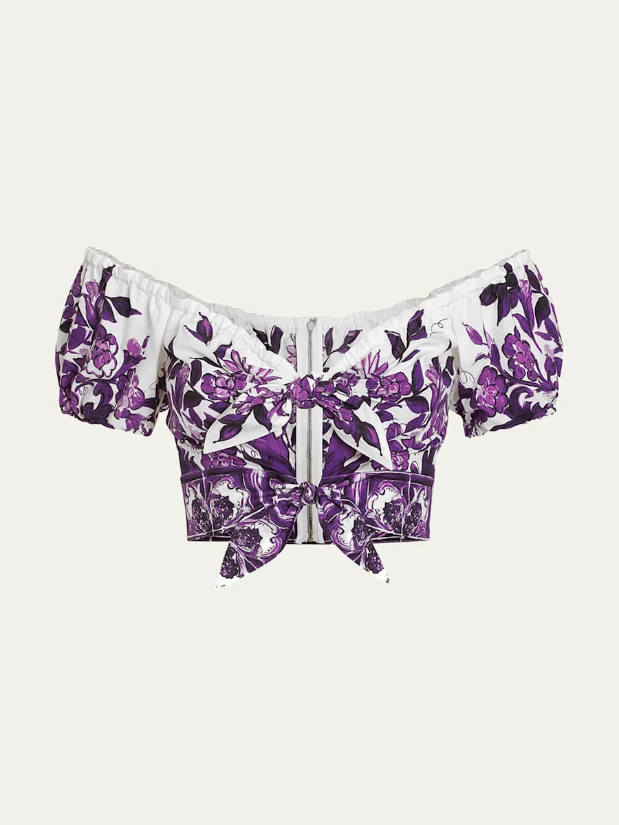 Dolceamp;Gabbana cotton poplin top featuring majolica print, knotted chest cutout, and a ruched neckline Offtheshoulder neckline Short puff sleeves Fitted Cropped length Back zip Cotton Made in Italy