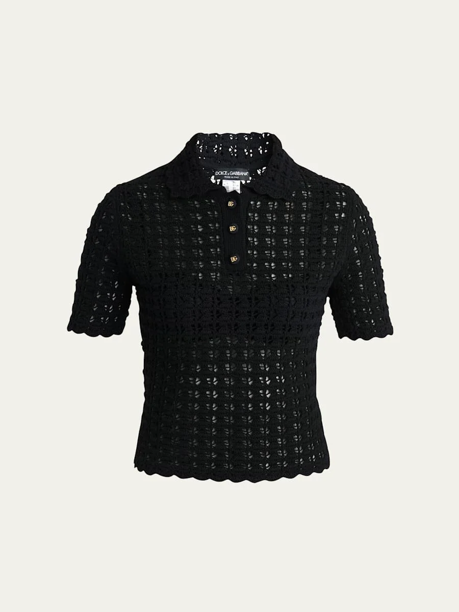 Dolce&Gabbana crochet polo top Spread collar; button placket Short sleeves Fitted Pullover style Virgin wool Made in Italy Model is 5'10"/177cm. Online Inquiries: BGS21_B9MUY| Store Inquiries: #4918100