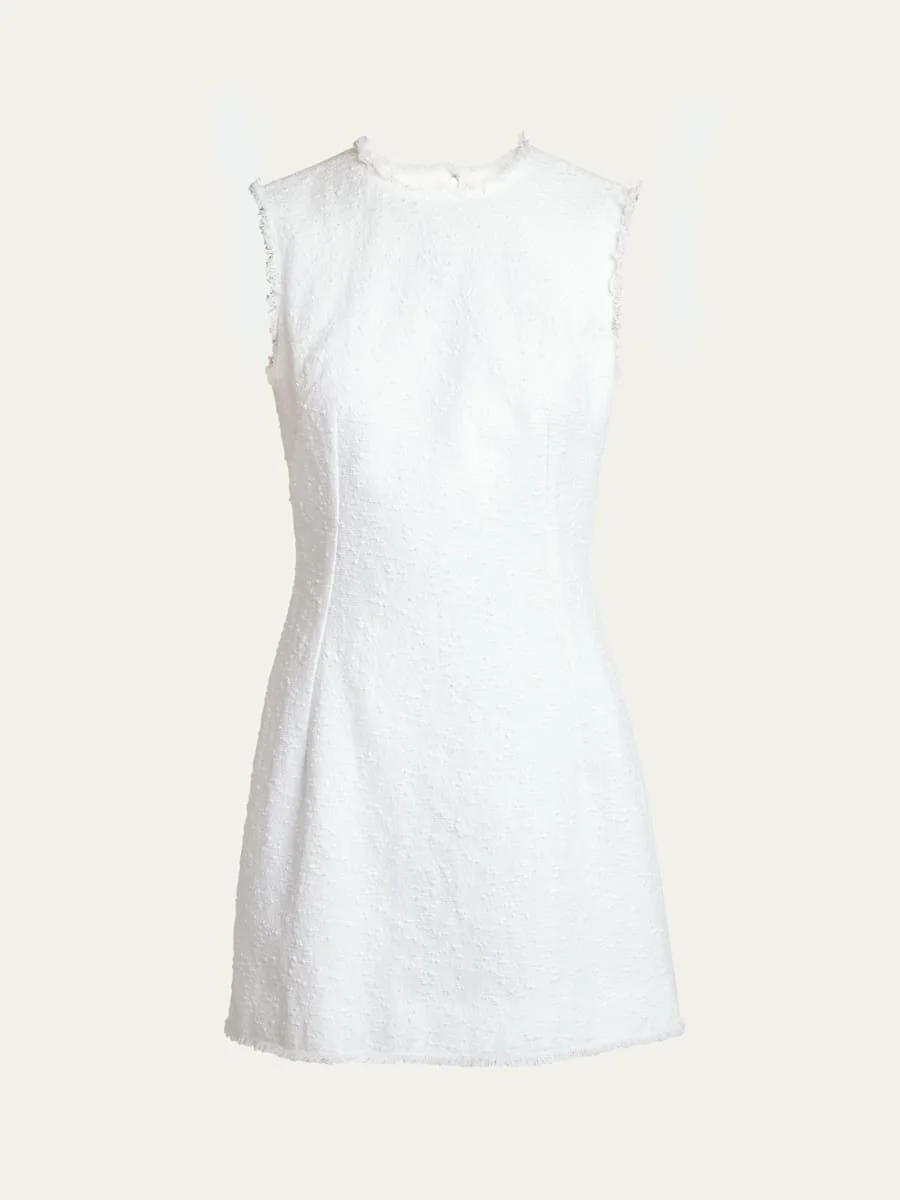 Dolce&Gabbana "Rachel" mini dress in a linen blend featuring frayed trimming Round neckline Sleeveless Hem hits around the knee A-line silhouette Concealed zip closure Cotton/linen Made in Italy Model is 5'10"/177cm. Online Inquiries: BGS21_B9929| Store Inquiries: #4810509