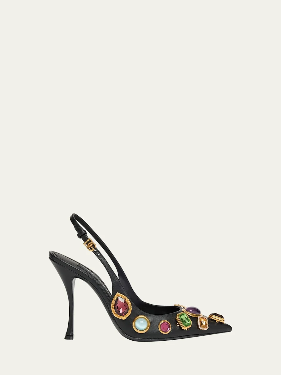 Dolce&Gabbana leather pumps with semiprecious stone accents 4.25 in / 105 mm stiletto heel Pointed toe Adjustable slingback strap with DG logo medallion Leather outsole Professional cleaning recommended, spot clean Made in Italy Online Inquiries: BGS21_X6W8M| Store Inquiries: #5016746