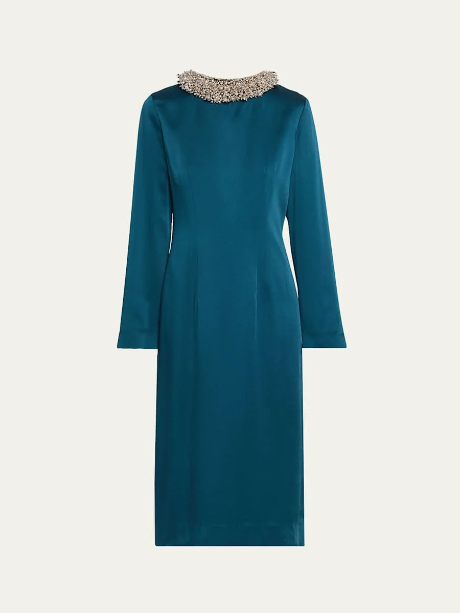 Dries Van Noten "Danora" satin dress finished with an embellished collar Crew neckline Long sleeves with button cuffs Sheath silhouette Hem falls below the knee Center back zip Acetate/viscose Dry clean Imported Online Inquiries: BGS21_BAANU| Store Inquiries: #5068643