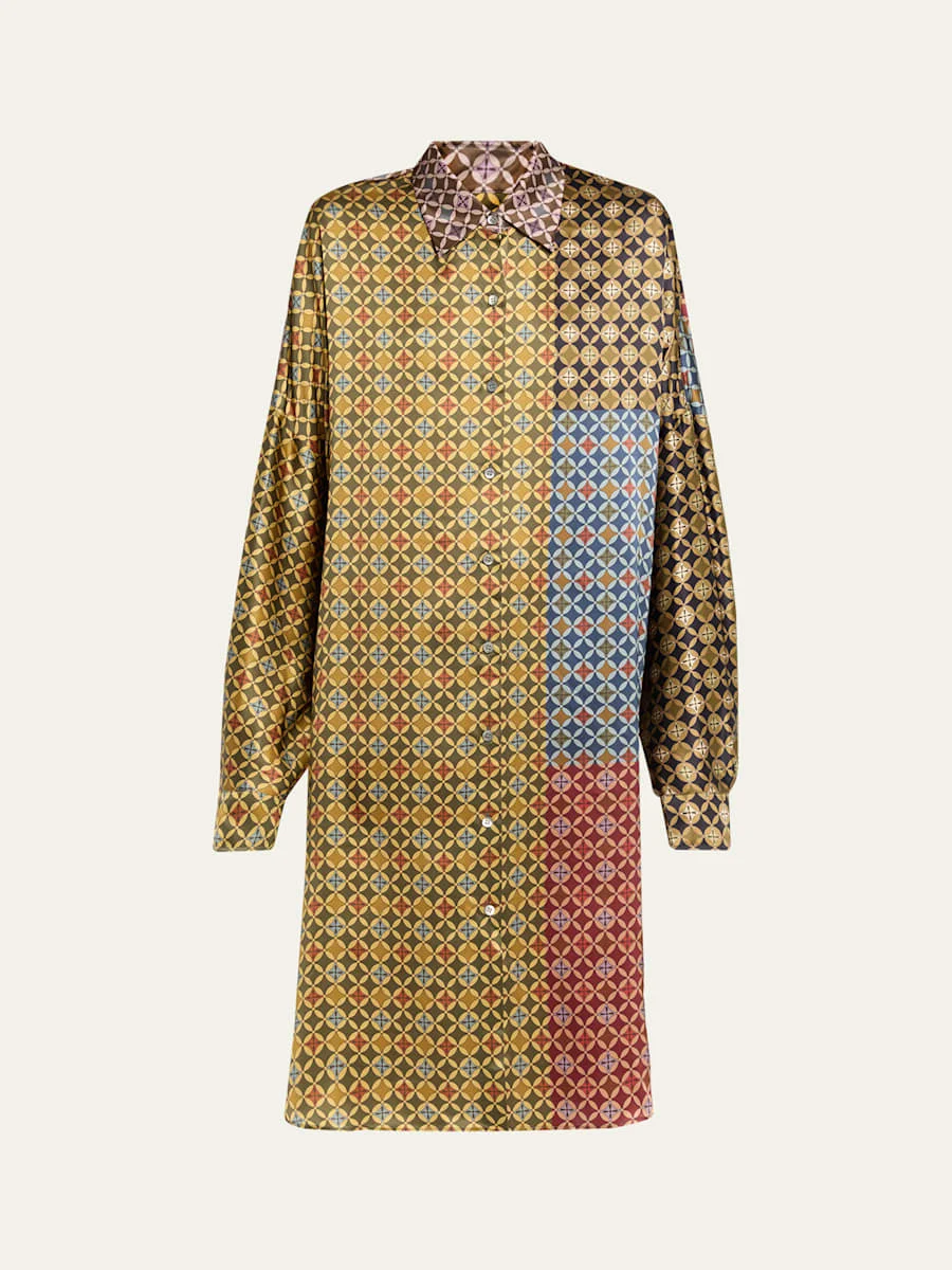 Dries Van Noten shirtdress is crafted of a flowy silk printed with a patchwork multi-print Point collar; button front Long sleeves; button cuffs Shift silhouette Knee length Silk Made in Hungary Online Inquiries: BGS21_BAAN6| Store Inquiries: #5068623