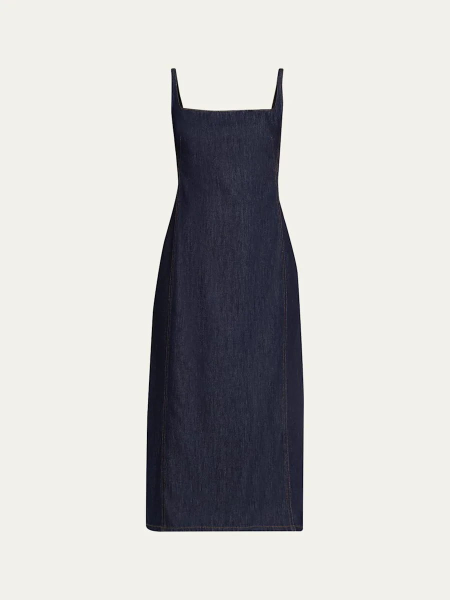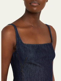 Crafted from nonstretch denim in a dark wash, the "Debano" dress by Dries Van Noten features contrast bodycontouring seaming Square neckline Sleeveless Centercut back vent Hem falls below the knee Sheath silhouette Center back zipper Cotton Imported