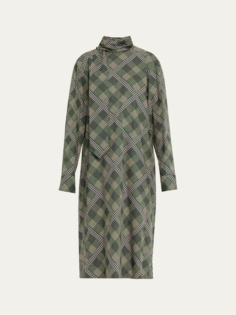 Dries Van Noten "Doddy" dress is crafted of a flowy cotton with a dotted check print and a scarf neck Mock neckline; selftie/keyhole back Long sleeves; French cuffs Gathered yoked back Shift silhouette Hem falls below the knee Slipover style Cotton Made in Hungary