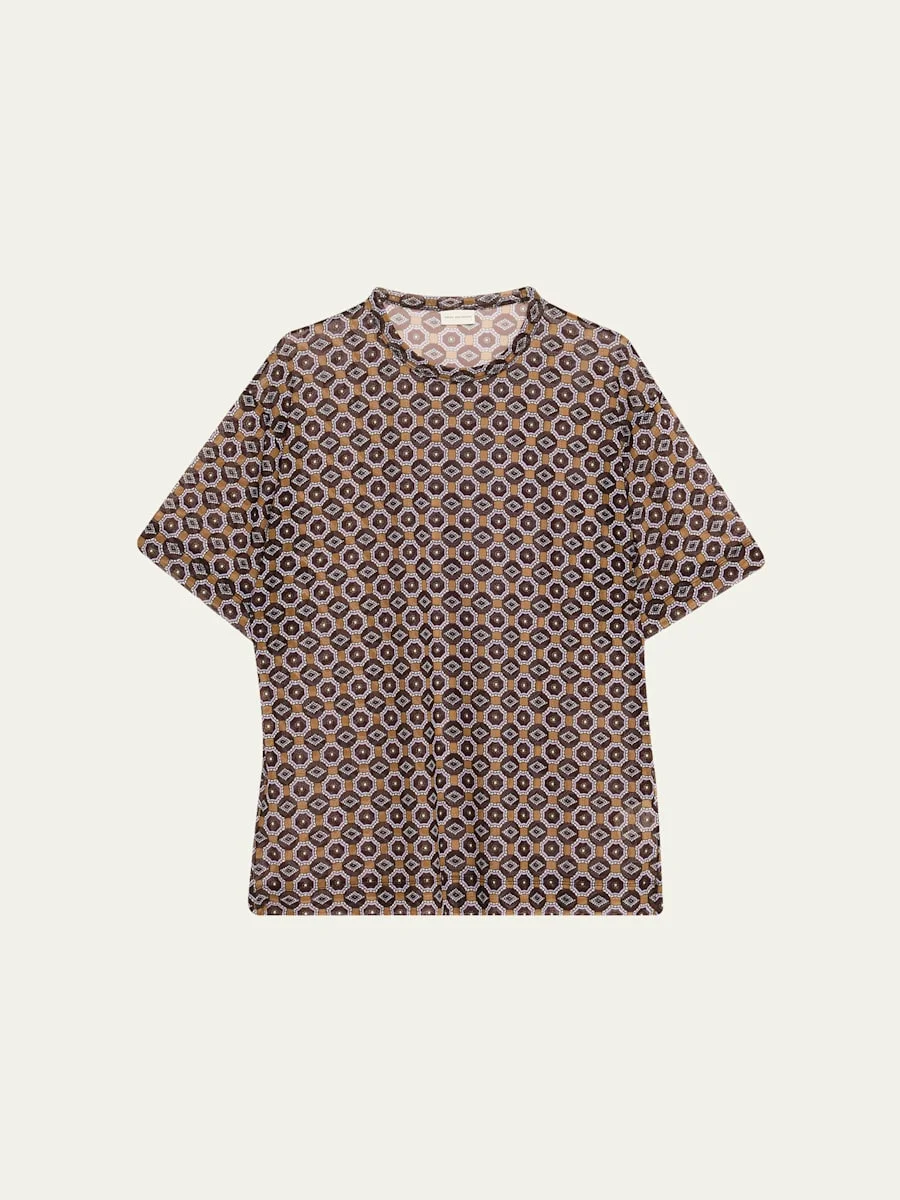 Designed with a slight stretch, the "Hoge" semi-sheer T-shirt from Dries Van Noten is produced with the brand's signature Mini Tie motif. Crew neckline Short sleeves Oversized silhouette Slipover style Nylon/polyamide/elastane Imported Online Inquiries: BGS21_BAAMT| Store Inquiries: #5068609
