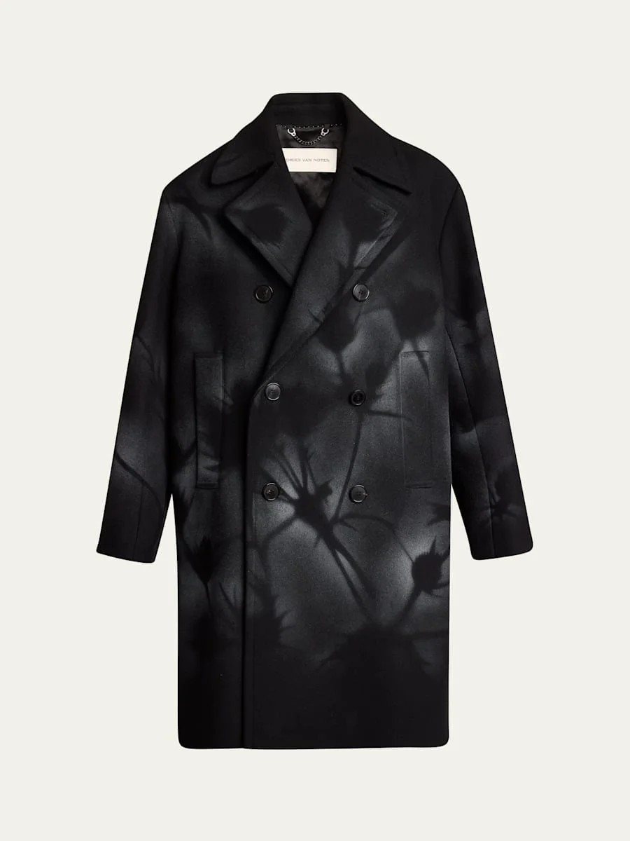 Dries Van Noten "Racos" woolen coat features a moody abstract pattern with a botanical motif Notched lapels Long sleeves Two front welt pockets Full length Oversized fit Doublebreasted closure Wool/nylon/polyamide Made in Poland