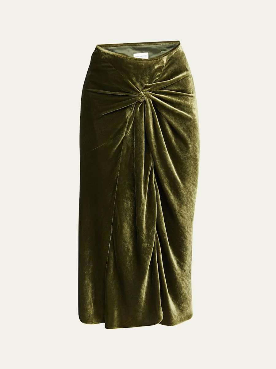 Dries Van Noten "Smila" velvet skirt features twisted draping, providing a flattering waistline Mid waist Hem falls below the knee A-line silhouette Back zip Viscose/silk Lining: Viscose Made in Poland Online Inquiries: BGS21_BAAKP| Store Inquiries: #5068500