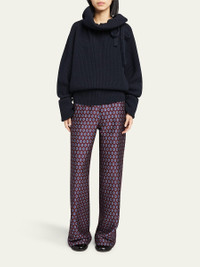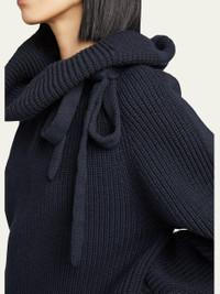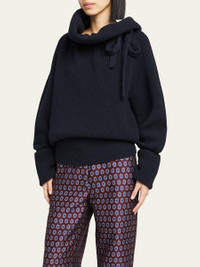 A slouchy neck finished with soft knit ties that drape casually adds a unique element to this ribbed knit sweater by Dries Van Noten Funnel neckline Dropped shoulders Long sleeves Relaxed fit Hip length Pullover style Wool Made in Belgium