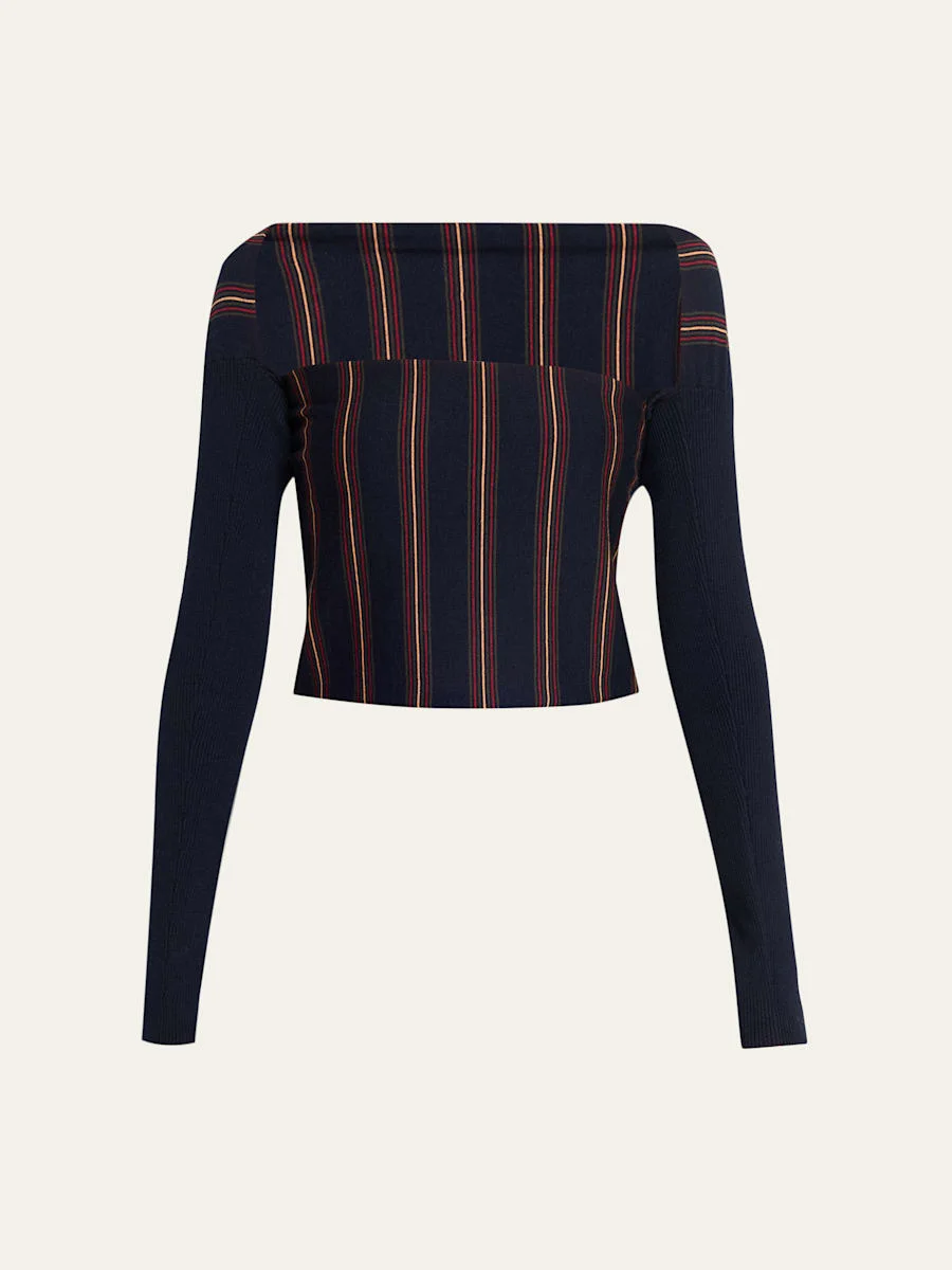 Dries Van Noten "Tiba" striped top featuring ribbed knit sleeves and a crossover back detail Square neckline Long sleeves Relaxed fit Cropped length Pullover style Wool Imported Online Inquiries: BGS21_BAAMZ| Store Inquiries: #5068616