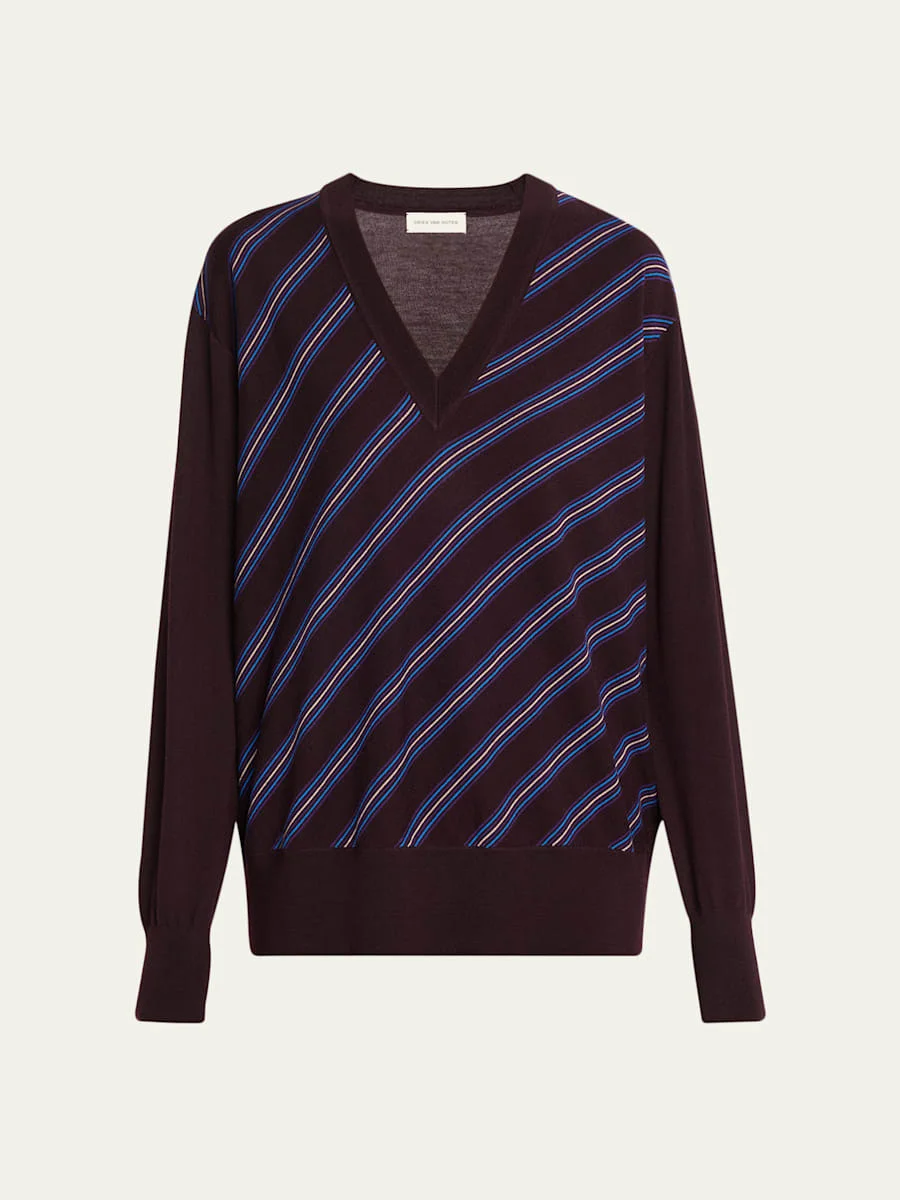 Composed of solid wool, the "Tishana" sweater by Dries Van Noten features a diagonal multi-striped front panel V neckline Dropped shoulders Long sleeves Relaxed fit Hip length Pullover style Wool Imported Online Inquiries: BGS21_BAANY| Store Inquiries: #5068647