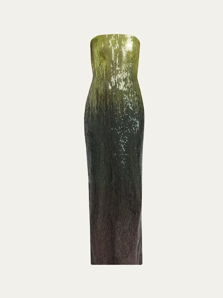 This Elie Saab gown is covered with cascading ombre sequins, designed in a column silhouette for effortless elegance Strapless neckline Sleeveless Center back slit Full length Column silhouette Invisible back zipper Polyester/silk Lining: Silk Made in Lebanon