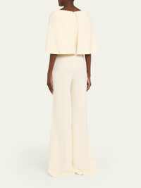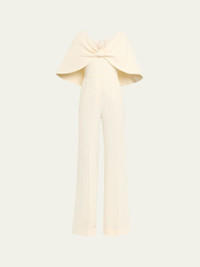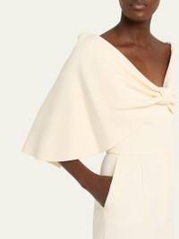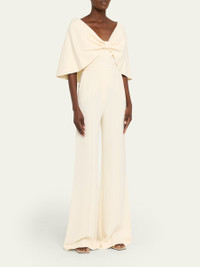 Crafted in structured cady, this Elie Saab jumpsuit is draped with a dramatic cape that's gathered in a front for a bow effect V neckline Elbow cape sleeves Side slant pockets Front and back pintucks Full length Wide legs Invisible back zipper Viscose/acetate/silk Dry clean Made in Lebanon Online Inquiries: BGS21_BA5MU| Store Inquiries: #5040376