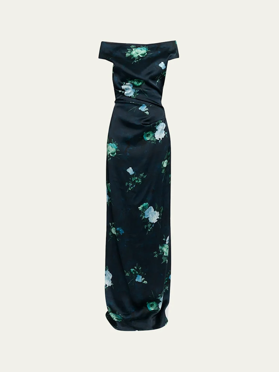 Erdem draped satin gown featured in an abstract rose placement print Off-the-shoulder neckline Short sleeves Center-cut back vent Column silhouette Full length Invisible back zipper Viscose Lining: Silk Dry clean Made in Poland Online Inquiries: BGS21_BAA9X| Store Inquiries: #5067004
