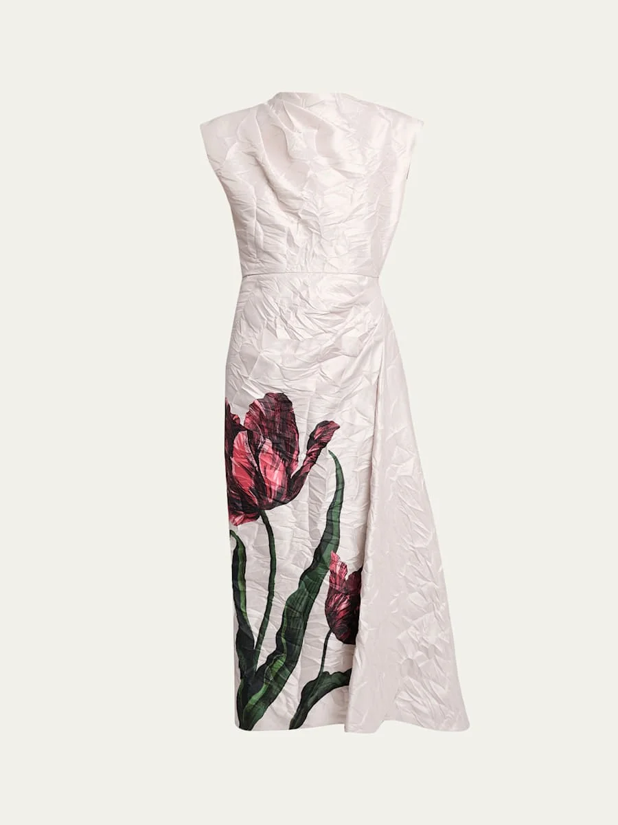 Crafted from crinkled satin, this dress from Erdem features a tulip print and a side drape High neckline Cap sleeves Aline silhouette Hem falls below the knee Invisible back zip Polyester Lining: Acetate/silk Dry clean Made in Portugal