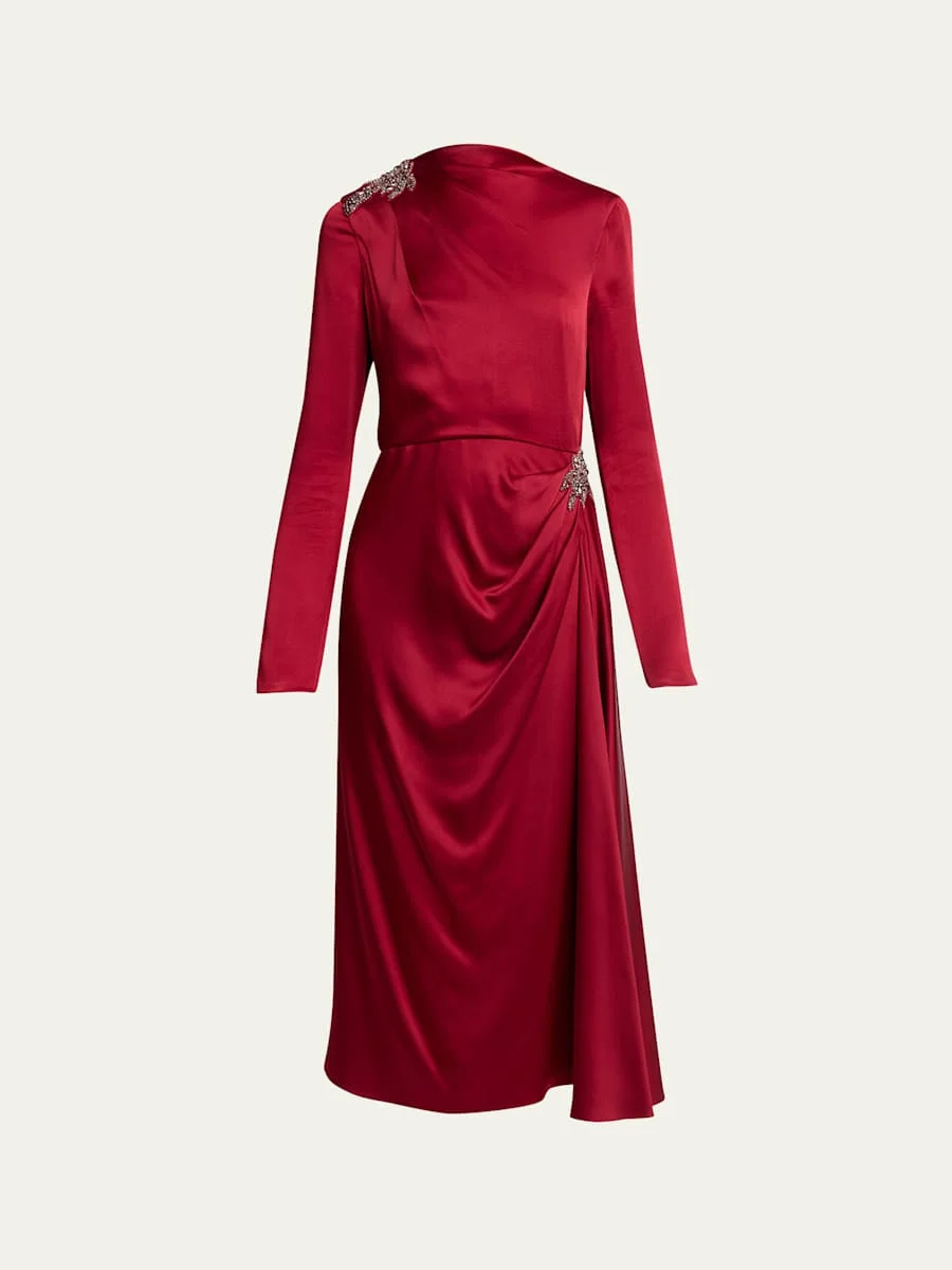 Crystal Long-Sleeve Draped Satin Midi Dress