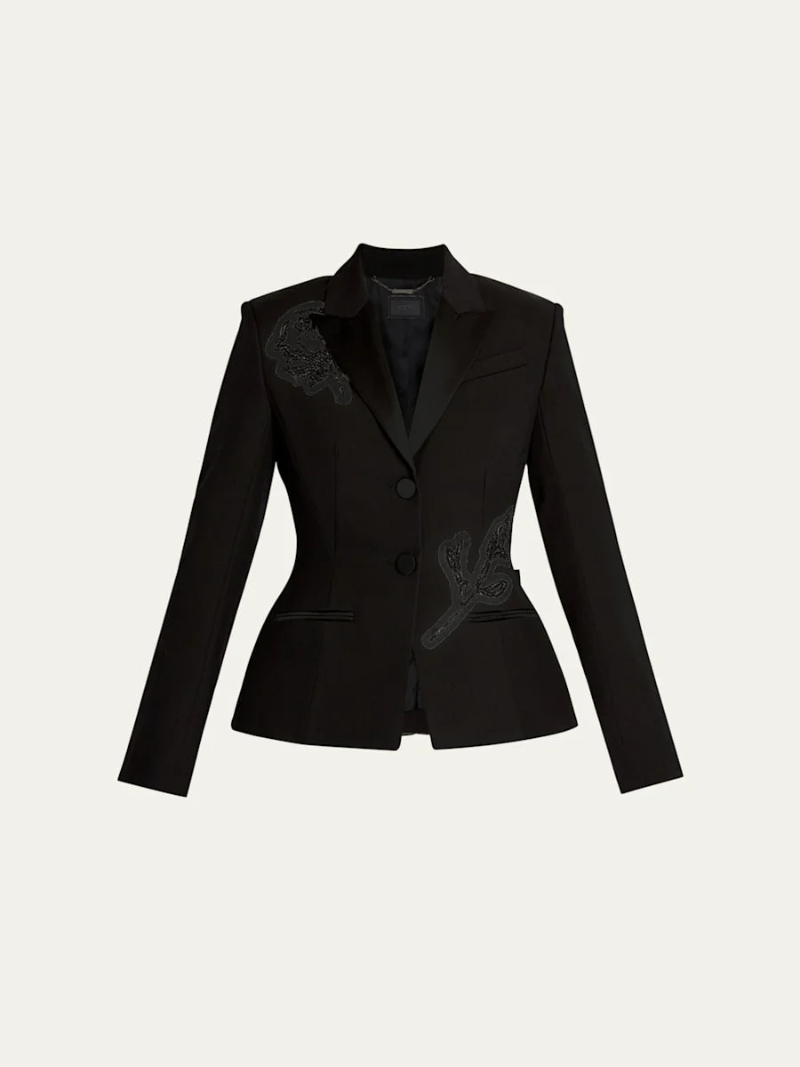 Erdem hourglass blazer featuring satin lapels and crystal rose embroidery Peak lapels; single-breasted front Long sleeves; button cuffs Chest welt pocket Hip welt pockets Fitted Virgin wool/polyester/silk Lining: Cupro Do not iron, dry clean Made in United Kingdom Online Inquiries: BGS21_BA6WG| Store Inquiries: #5042750