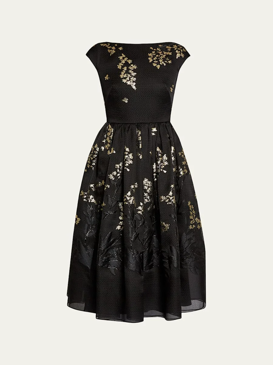 Metallic and tonal jacquardwoven florals, along with an organza overlay, define this Erdem cocktail dress. Bateau neckline Short cap sleeves Hem falls below the knee Fit amp; flare silhouette Concealed back zip closure Silk/polyester Lining: Silk Made in Portugal
