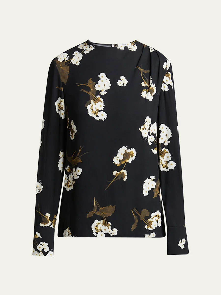 Erdem draped top in floral print Round neckline; back closure Long sleeves Straight fit Pullover style Viscose Dry clean Made in Bulgaria Online Inquiries: BGS21_B9S2K| Store Inquiries: #4953969