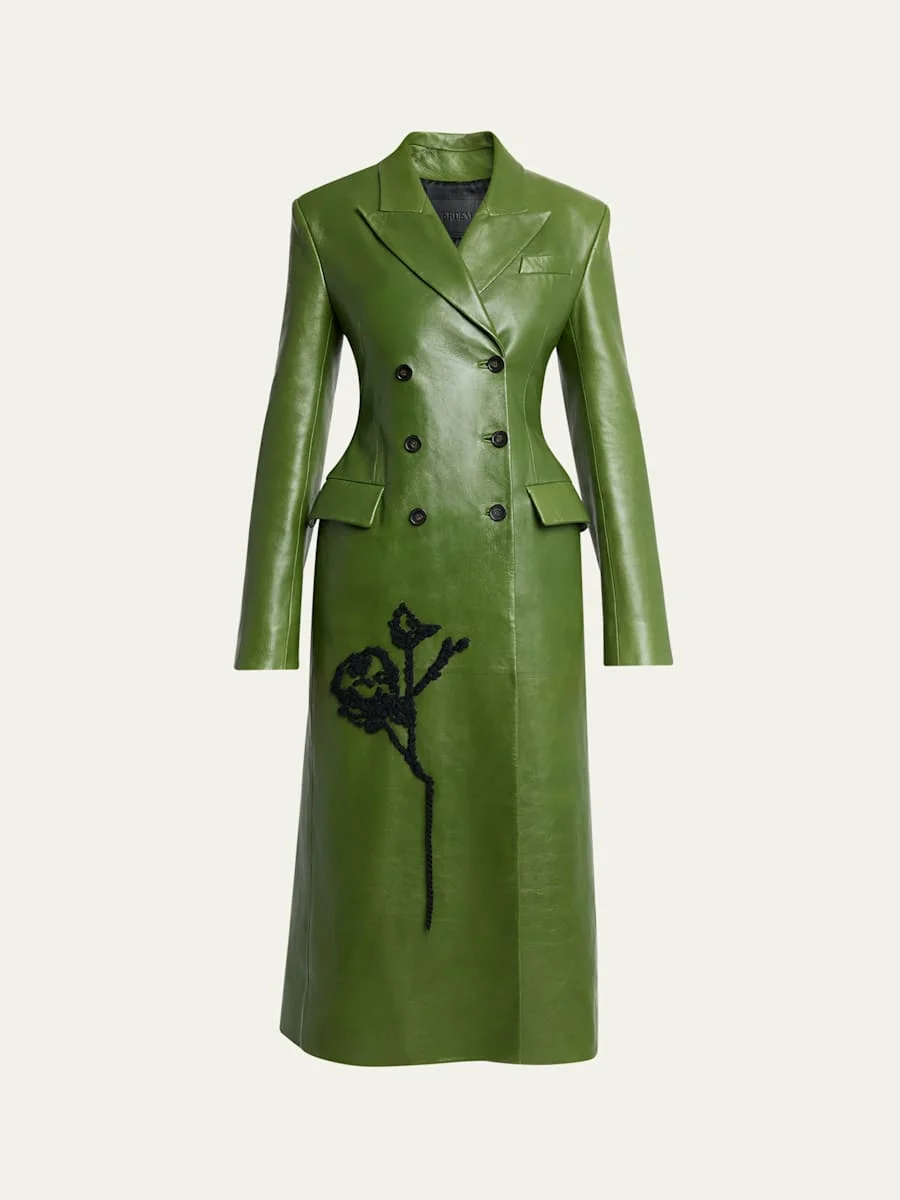 Floral Embroidered Double-Breasted Leather Coat