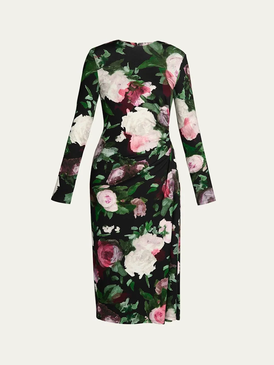 Erdem dress featuring floral print and waist draping Round neckline Long sleeves Sheath silhouette Hem falls below the knee Invisible back zip Viscose/elastane Do not iron, dry clean Made in Portugal Online Inquiries: BGS21_BA6WA| Store Inquiries: #5042744