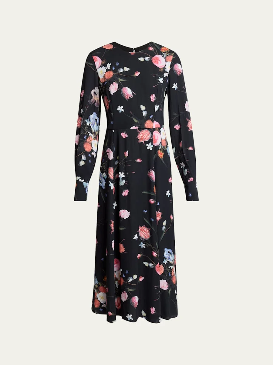 FLORAL PRINT CREPE LONG SLEEVE MIDI DRESS