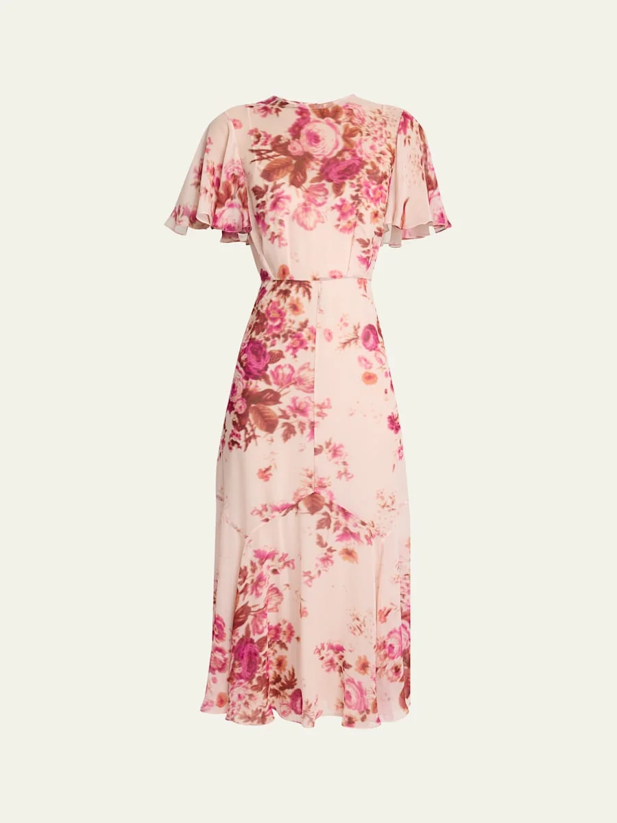 Cut from silk voile, this midi dress from Erdem is decorated with a romantic floral print and flaunts flutter sleeves and a fluid hem Jewel neckline Short flutter sleeves Hem falls below the knee Aline silhouette Invisible back zipper Silk Lining: Silk Dry clean Made in Bulgaria