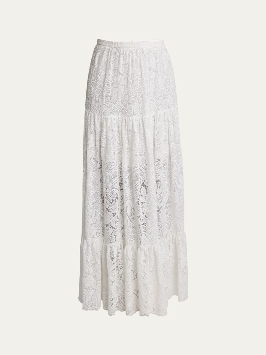 Erdem tiered full volume skirt in floral lace Sits high on the waist Falls below the ankle A-line silhouette Zip closure Cotton/nylon/polyamide Lining: Cotton Imported Online Inquiries: BGS21_BA4JA| Store Inquiries: #5033584