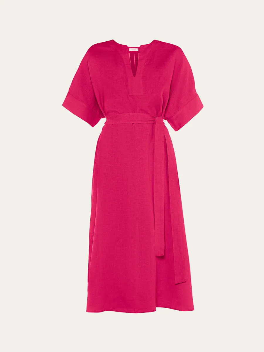 Eres "Bibi" kaftan-style dress crafted from a lightweight stretch linen fabrication V neckline Relaxed elbow-length sleeves Removable self-tie belt Mini side slits Full length A-line silhouette Slipover style Linen/spandex Made in Bulgaria Model is 5'10"/177cm. Online Inquiries: BGS21_T5KSX| Store Inquiries: #4742825