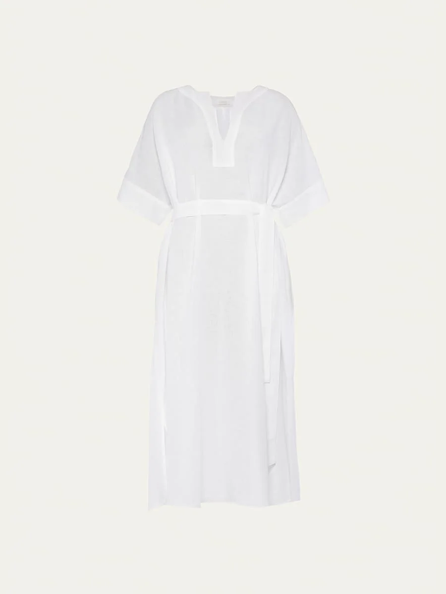Eres "Bibi" kaftan-style dress crafted from a lightweight stretch linen fabrication V neckline Relaxed elbow-length sleeves Removable self-tie belt Mini side slits Full length A-line silhouette Slipover style Linen/spandex Made in Bulgaria Model is 5'10"/177cm. Online Inquiries: BGS21_T5KSX| Store Inquiries: #4742825