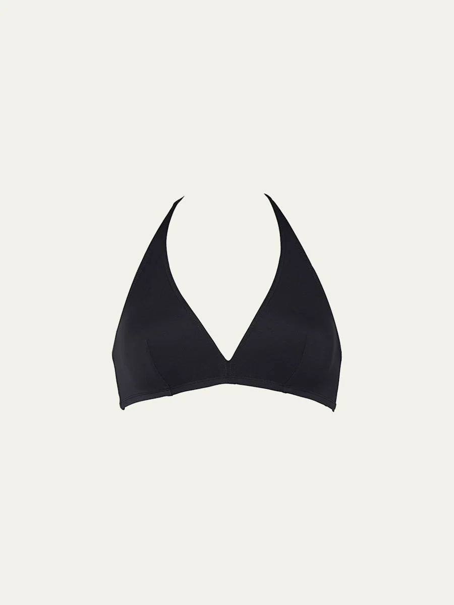 Eres "Gang" solid bikini top. Halter neckline. Fixed triangle cups. Banded under bust. Nylon/spandex. Made in France. Bottoms sold separately. Online Inquiries: BGS21_T1038| Store Inquiries: #3429078