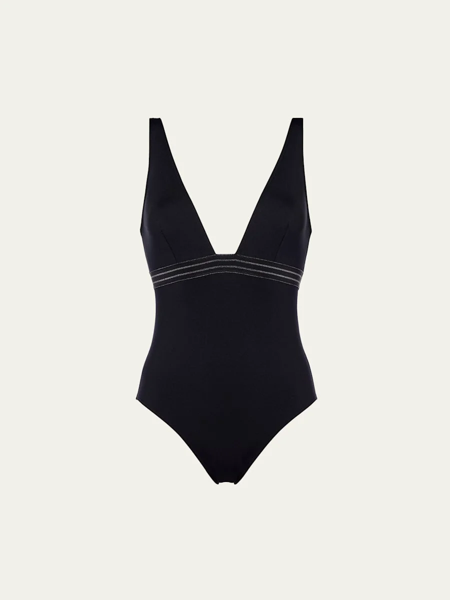 Eres "Sillage" tank onepiece swimsuit with an elasticated grosgrain ribbed adorned with lurex Plunge neckline Moderate seat coverage Nylon/polyamide/spandex Made in Italy