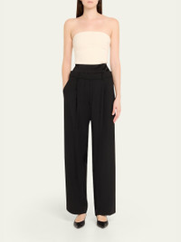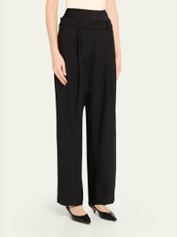 The "Portia" wool-blend trousers by ESSE Studios can take your look from office to night out with a duo waistband that is sure to make a statement. Approx. 14.5" rise; 33" inseam; 47" outseam High rise Pleated front Four-pocket style Wide legs Full length Center back zip Wool/acetate Lining: Acetate Dry clean Made in Australia Online Inquiries: BGS21_T6VY0| Store Inquiries: #5046764