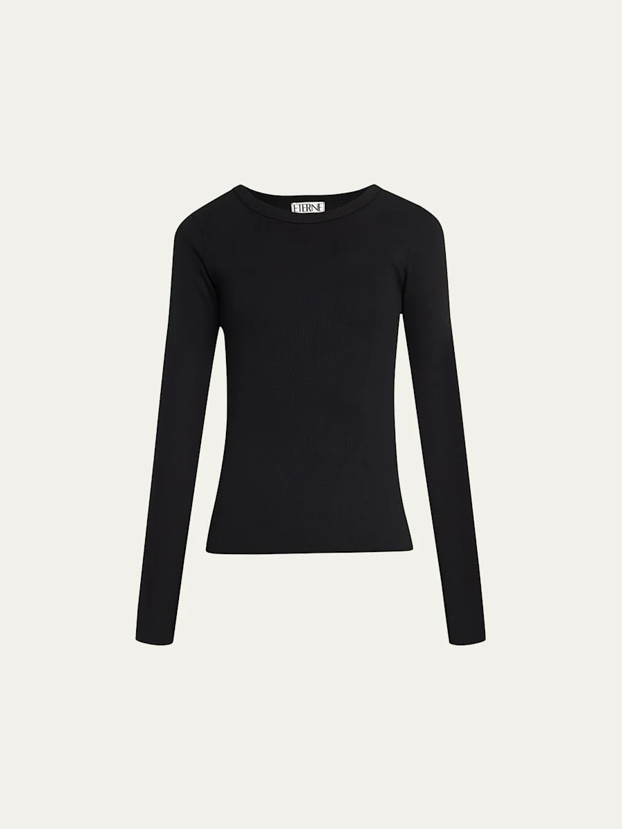 Eterne flattering ribbed knit top Crew neckline Long sleeves Slim fit Pullover style Cotton/rayon/spandex Made in USA from imported materials Model is 5'10"/177cm. Online Inquiries: BGS21_T4B70| Store Inquiries: #4458934
