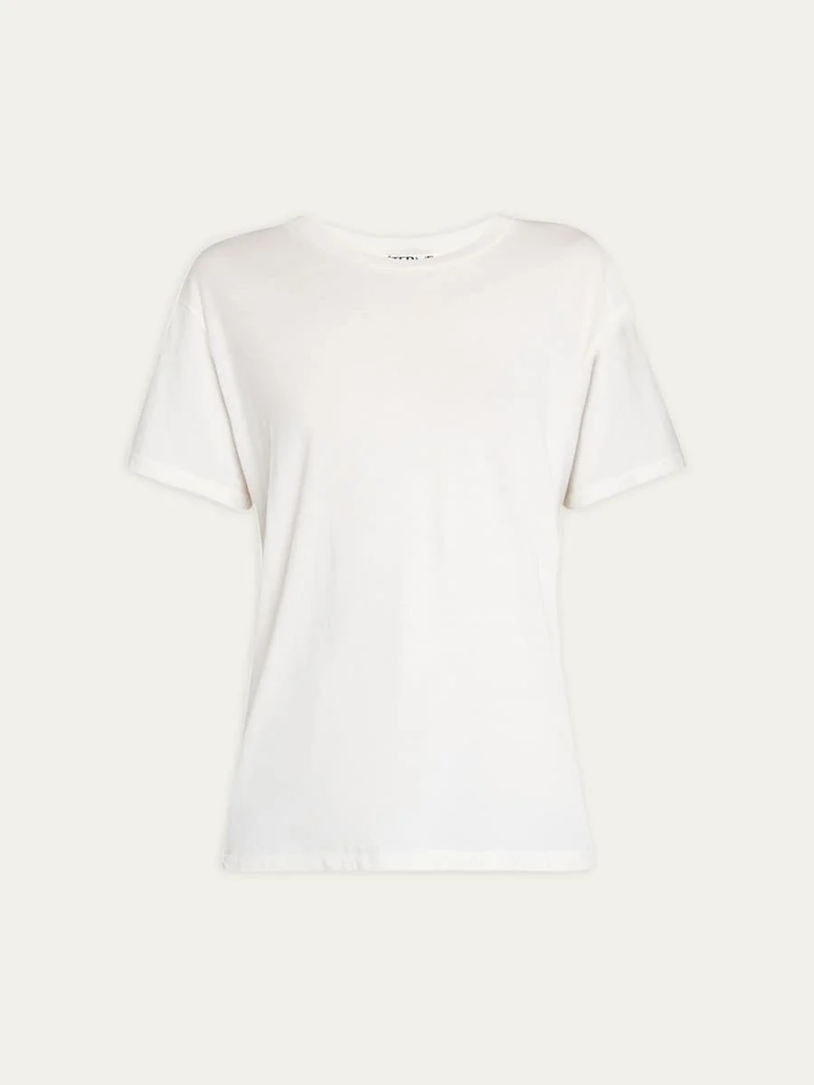 Eterne T-shirt with an unfinished raw edge detail on the neckline Scoop neckline Short sleeves Relaxed fit Pullover style Cotton/modal Made in USA from imported materials Model is 5'10"/177cm. Online Inquiries: BGS21_T8TDM| Store Inquiries: #4458928