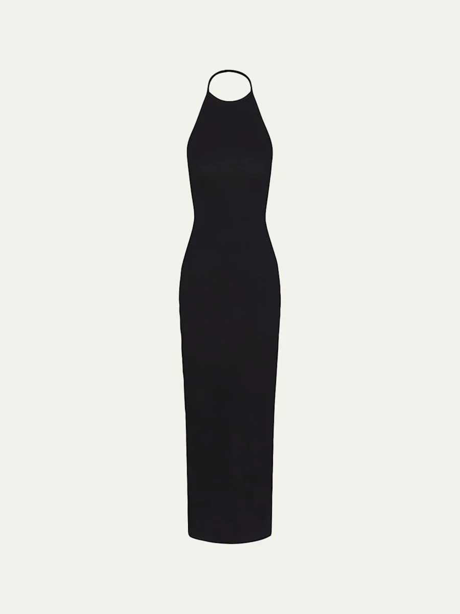Eterne "Vivian" dress crafted from a soft jersey modal blend Halter neckline Sleeveless Low-cut open back Full length Body-skimming silhouette Mid-back clasps Modal/spandex Made in USA from imported materials Online Inquiries: BGS21_T6N0A| Store Inquiries: #5015631