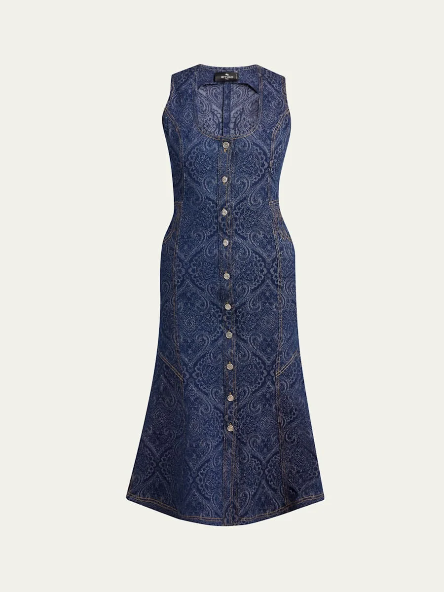 Etro denim midi dress featuring a paisley-print Scoop neckline Sleeveless Waist slip pockets; back patch pockets Fit-and-flare silhouette Hem falls below the knee Button-front Cotton/elastane Professional cleaning recommended Made in Italy Online Inquiries: BGS21_BA722| Store Inquiries: #5043911