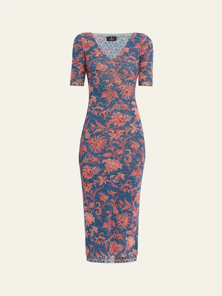 Crafted from layered stretch tulle, this dress from Etro features an allover floral print with a micro palmtree printed underlayer V neckline Short sleeves Sheath silhouette Hem falls below the knee Slipover style Cotton Professional cleaning recommended Made in Italy SIZE amp; FITModel measurements: 5'10" tall Model is wearing a US size 4/Small
